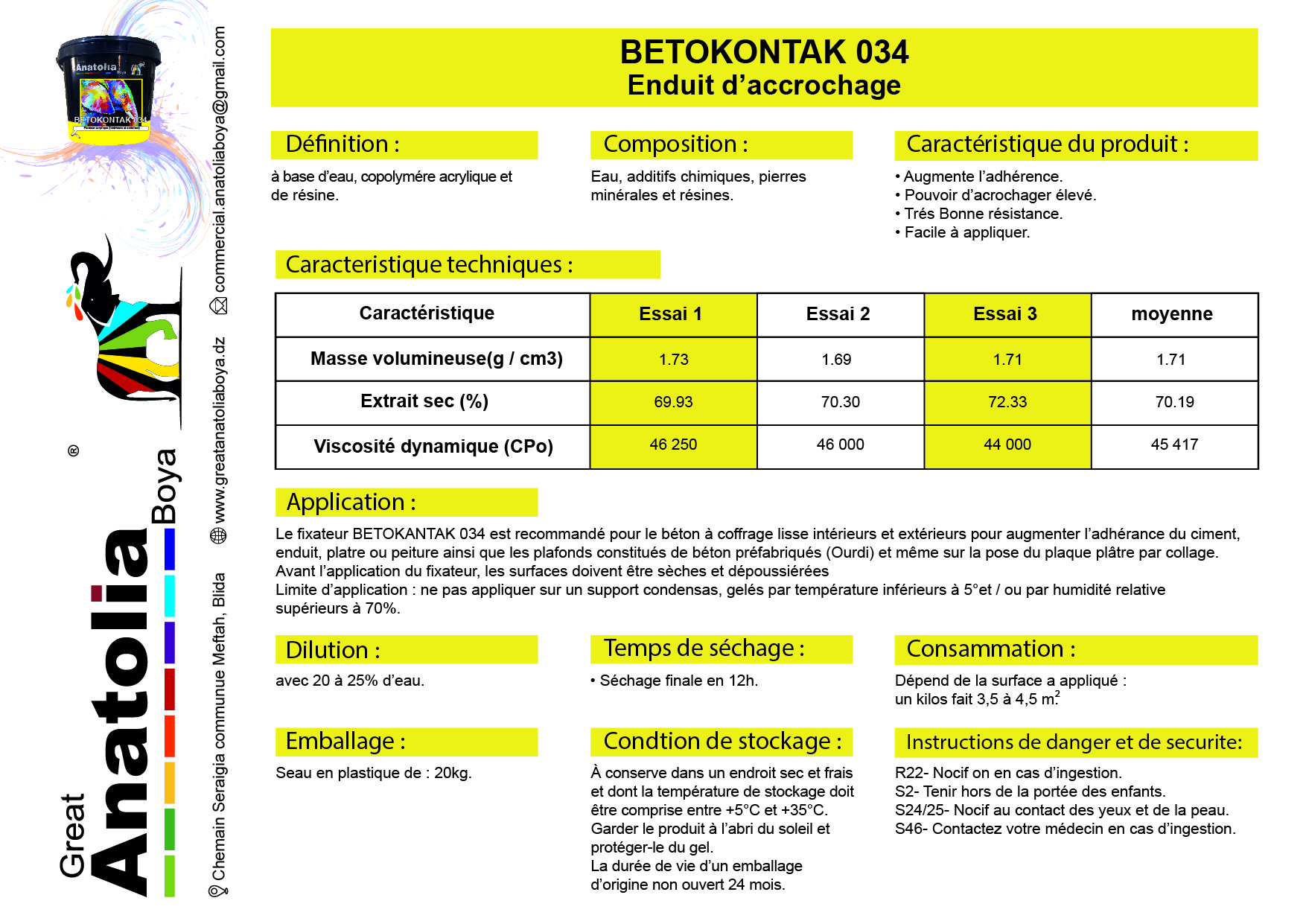 Séchage : 12h Dilution : 20% d’eau par seau Conseils d’application : Les surfaces doivent être netoyées, sèches et depoussiérées.