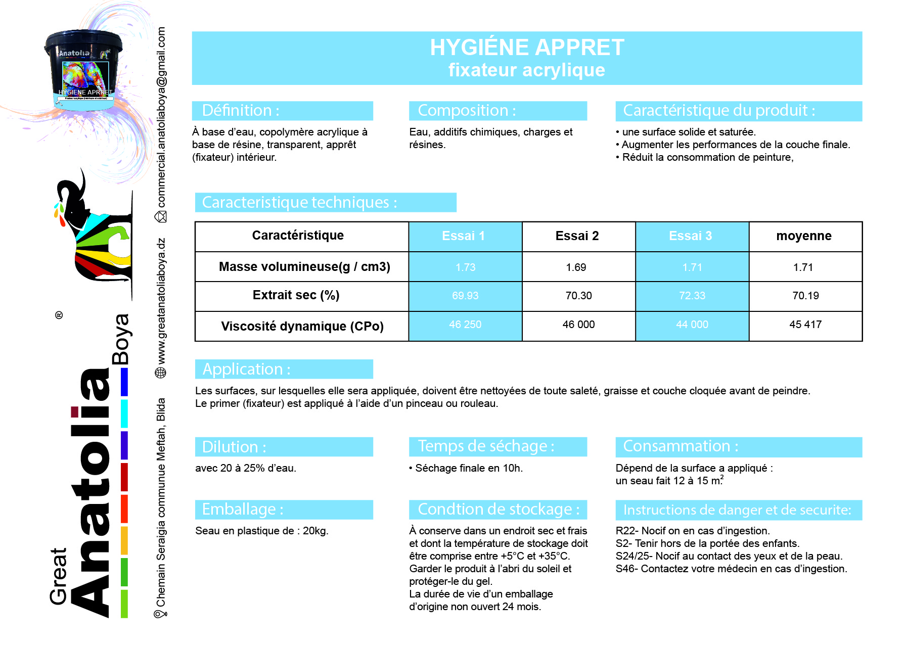 Séchage : 8 à 10h Dilution : 20 à 25% d’eau par seau Conseils d’application : Les surfaces doivent être netoyées,sèches et depoussiérées.