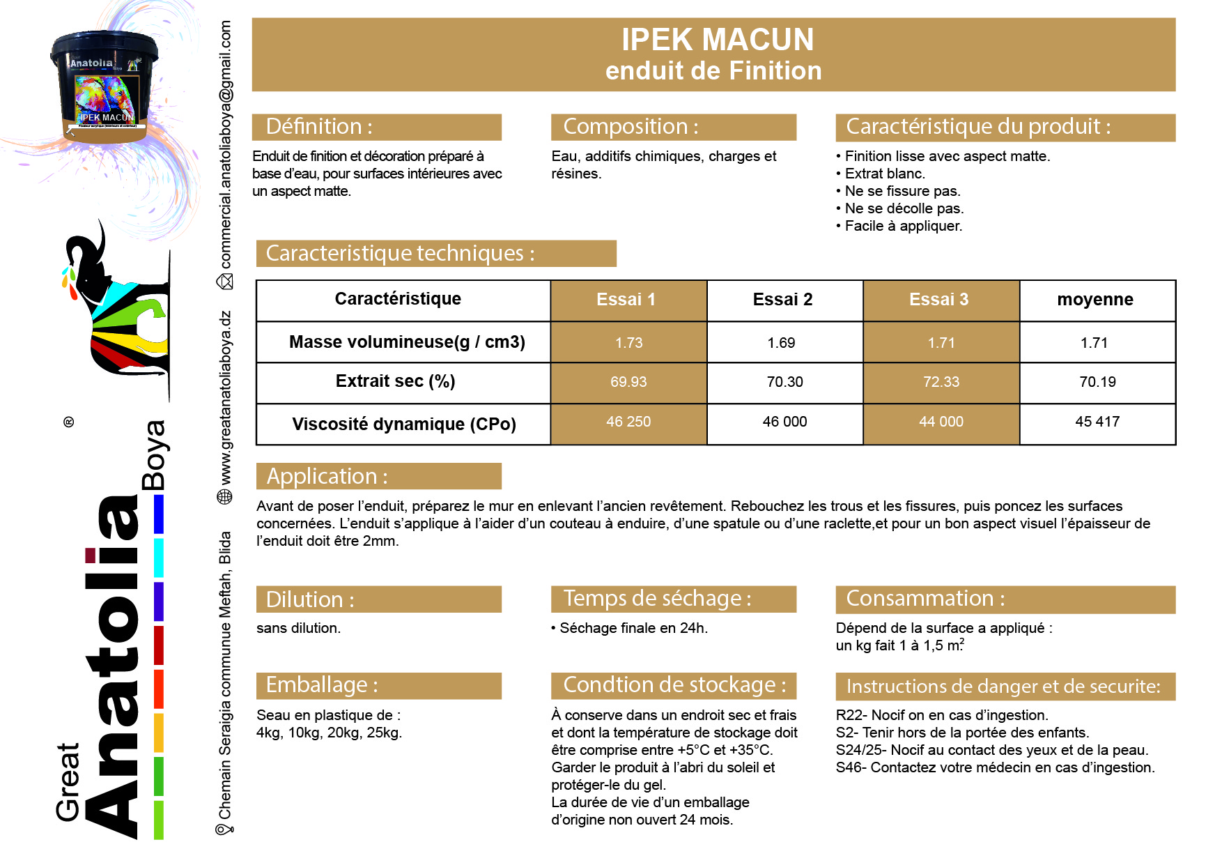Séchage : 24h Dilution : sans Conseils d’application : Les surfaces doivent être netoyées,sèches et depoussiérées.