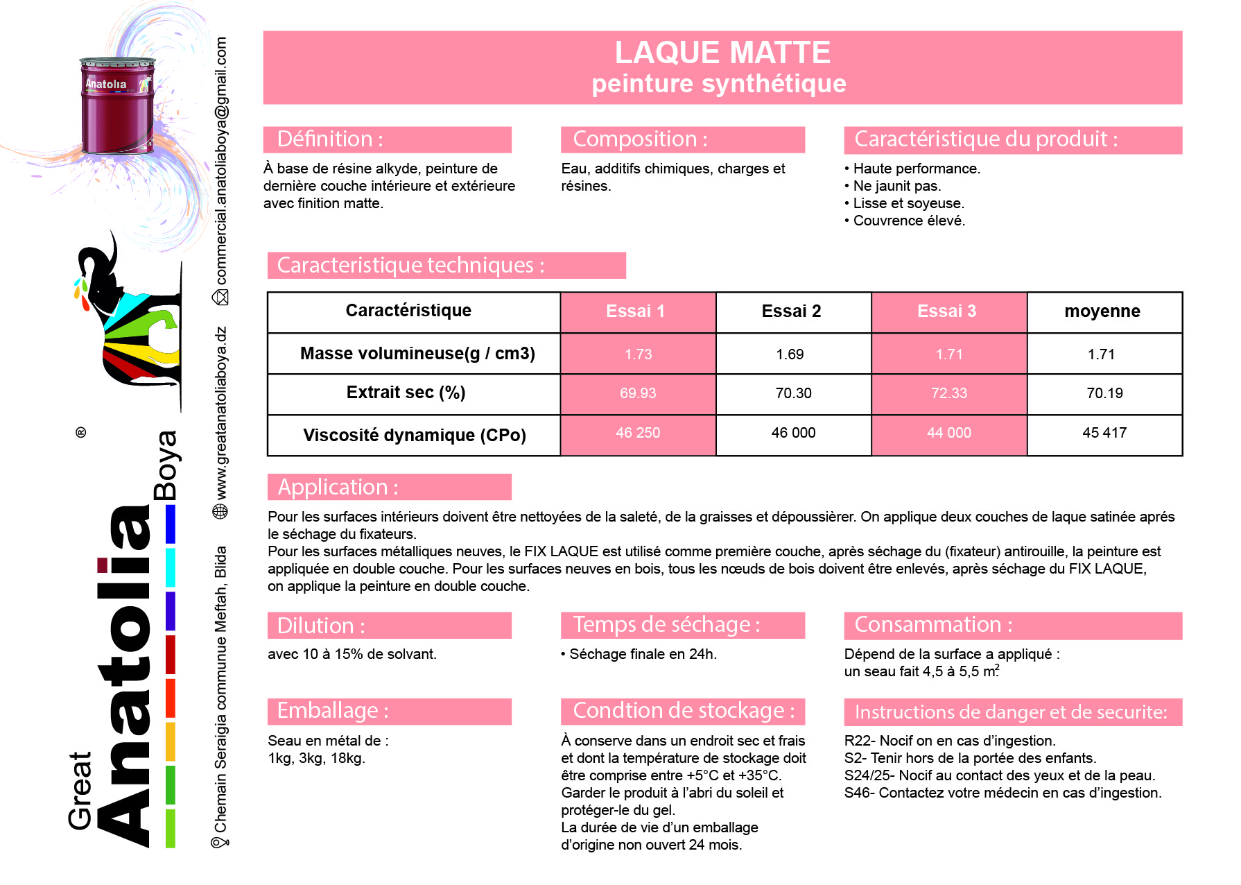 Avantages : • Bonne résistance. • Ne jaunit pas. • Lisse et soyeuse. • Couvrance élevé. Support :