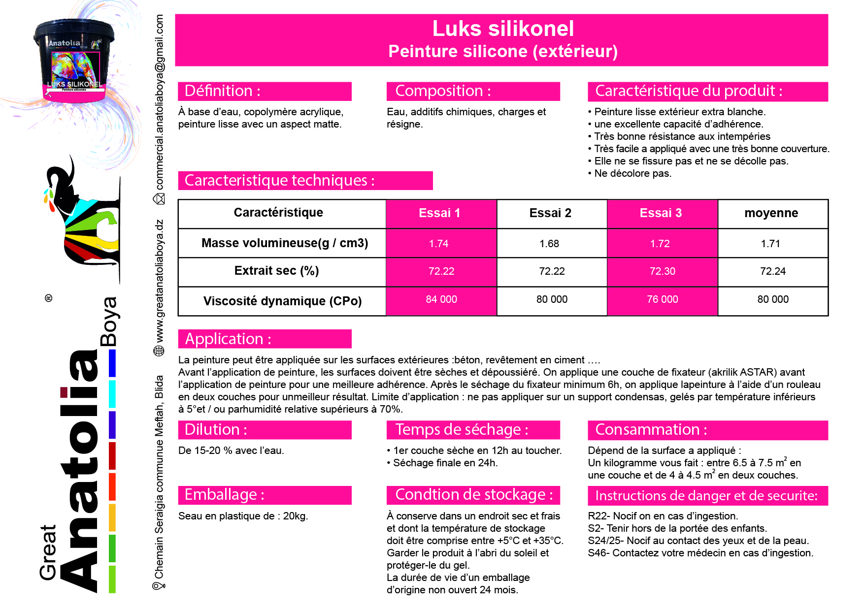 Séchage : 12 à 24h Dilution : de 15 – 20% avec l’eau Conseils d’application : • une couche de fixateur AKRILIK ASTAR pour une meilleure adhérence.