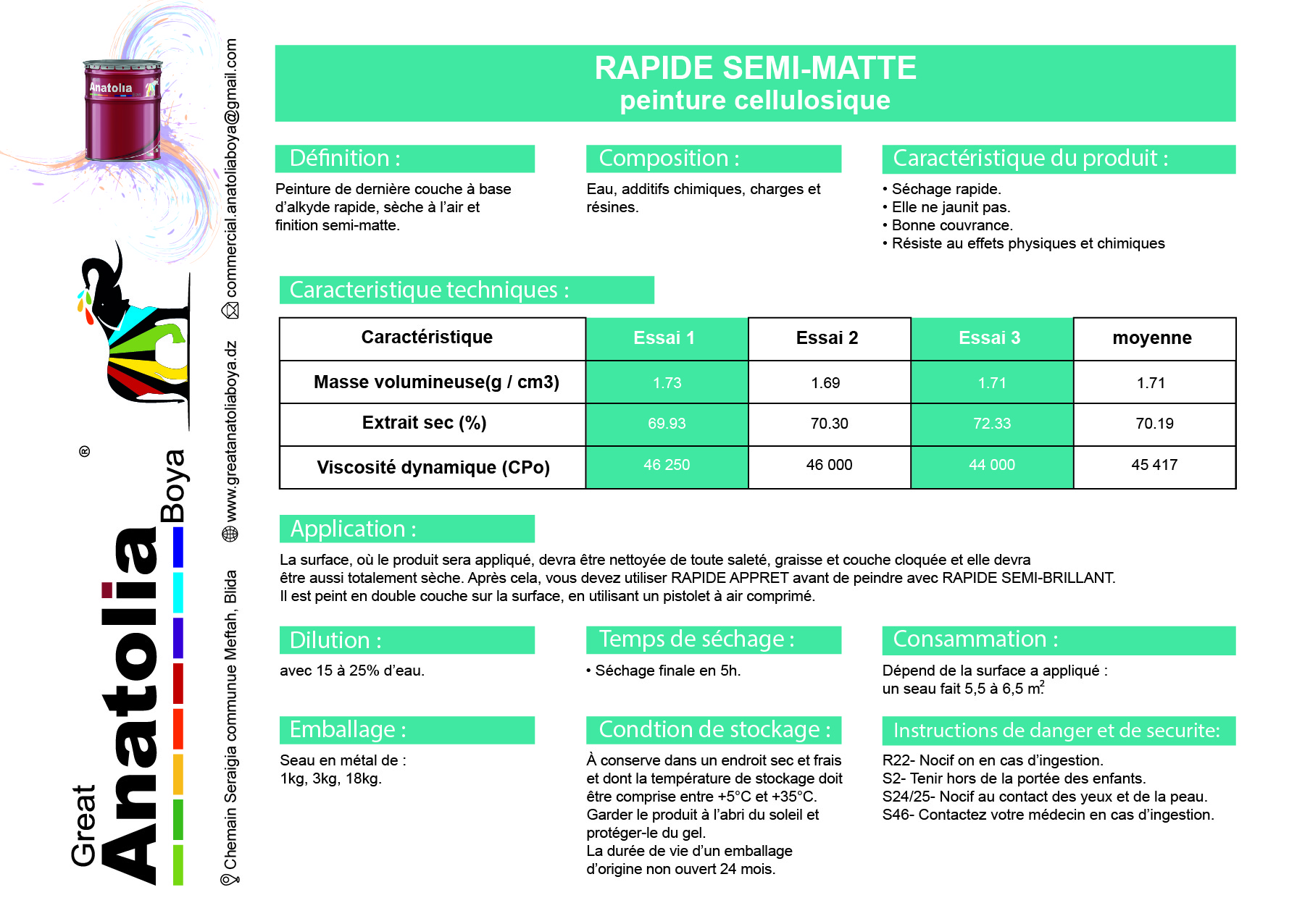 Séchage : Séchage finale 24h Dilution : de 10 – 15% avec solvant Conseils d’application : Application avec un pistolet compresseur à air.